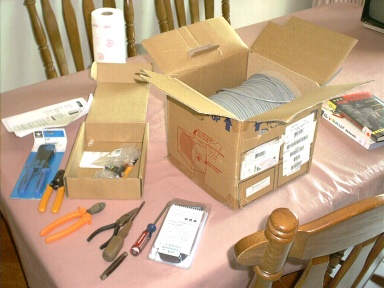 The folks at work graciously let me use their cable, boots, and crimper tools to make the Cat 5 network cables I needed for my network. They also had a "Microtest" tester that tests the crimped cable connectors that are installed to see if all 8 wires are connected properly. I stripped the outer sheath, then the insulation off of all 8 wires, put the 8 wires in the correct order by color, and fitted them inside the RC-45 connector boot. Unfortunately the tester appeared to malfunction, showing the same reading whether a connector was inserted or not. I found out later that it was not working properly. I tried 3 different cables. Being anxious to get my network set up, I went to an Electronics store and bought the needed cables. What I learned: making network cable ends is tedious & would come easier with a lot of practice. In a corporate environment the books about networks that I'm reading suggest that the cable installation be contracted out to professionals, and now I can see why. I don't think it would be cost-effective to pay employees to make & run these cables, compared to the time that could be saved by hiring professionals.